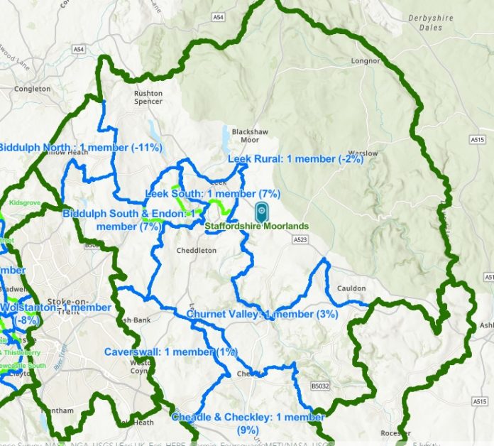 Under a council size of 62, Staffordshire Moorlands District Council will have seven councillors, with each councillor representing on average 2% more electors than the county average.