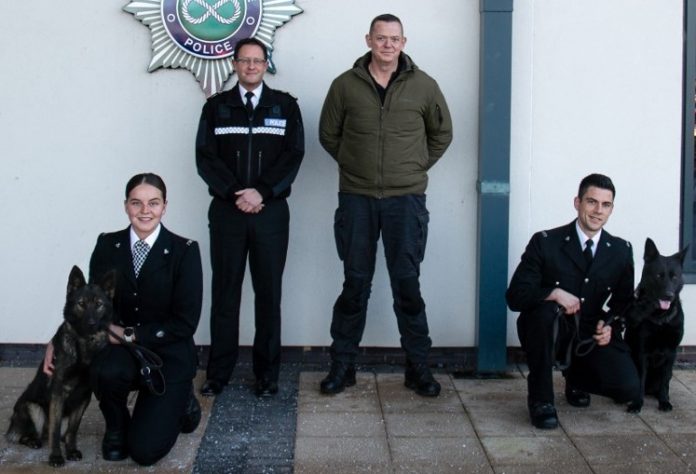 PC Luke Nixon and PD Maddie, two, celebrated their graduation alongside PC Leah Smith and one-year-old PD Bones on Thursday (30th November). They were congratulated by Chief Constable Chris Noble (pictured centre-left) and PC Scott Tatton (centre-right).