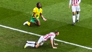 45+5 As the crowd boo Asante, Pearson barges him over, much to the crowd’s pleasure